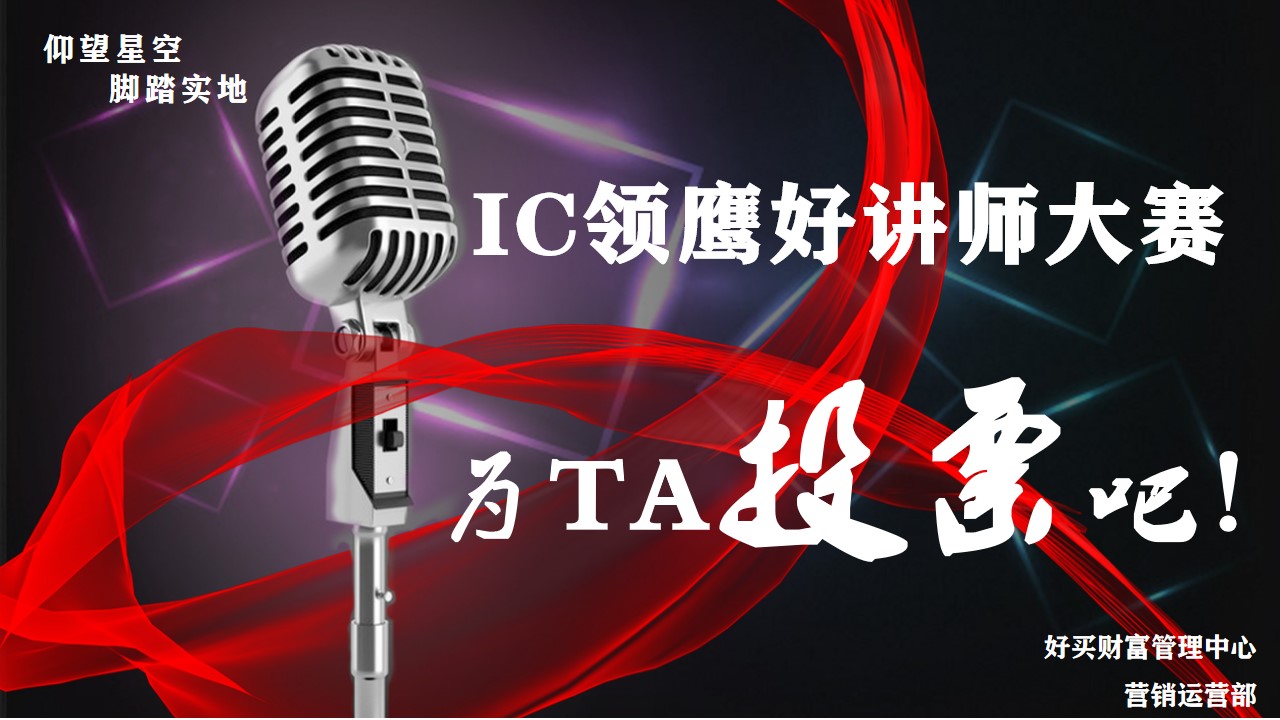 由好买财富管理中心发起并主办的“IC领鹰好讲师大赛-第1季”在万众瞩目中终于拉开帷幕。选手的得票数将直接影响其比赛的最终成绩,请您为支持的选手讲师投票,每人每日皆可投5票!投票截止时间为5月27日下午17:00。期待您的热情参与!