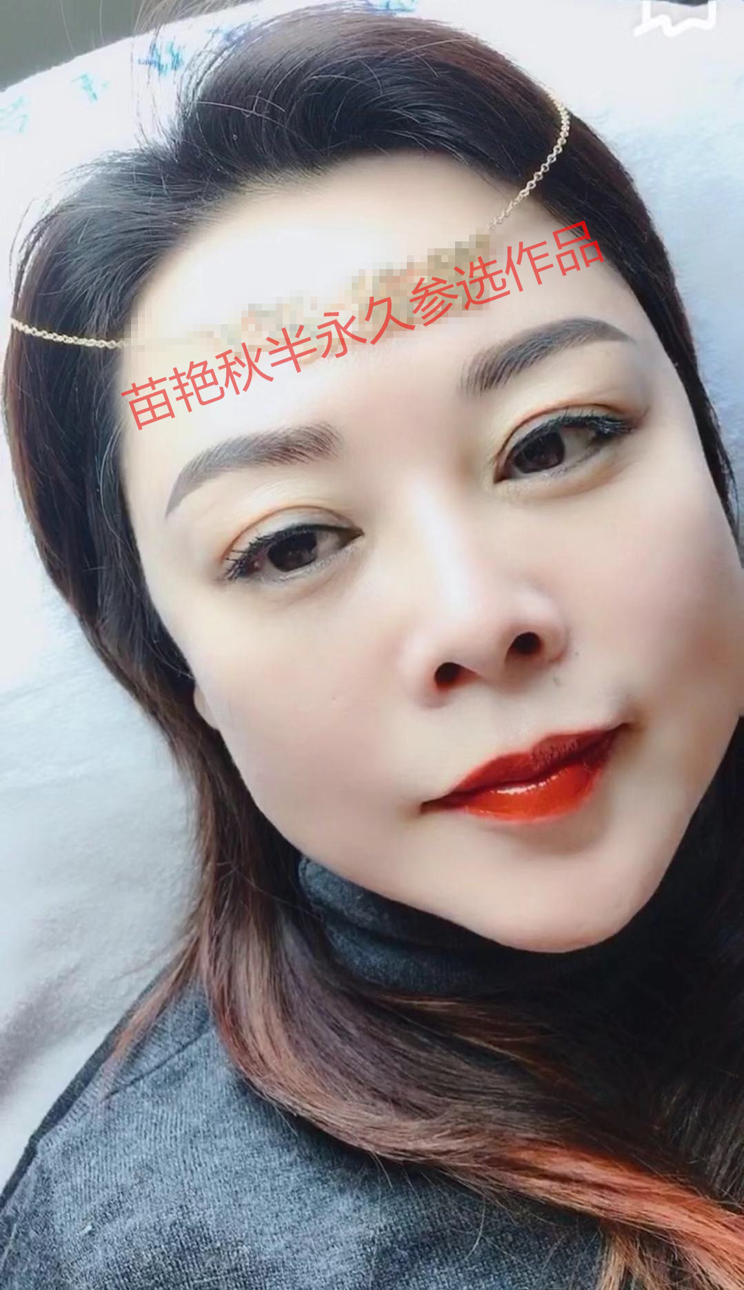 唇:正红+草莓红,年纪偏小的客人,更易打造出水嫩自然唇色。深红膏+白色+封釉膏锁色,添加白色达到使其颜色变浅的效果,也可用于唇部最后提亮使用。
