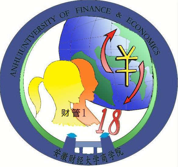 班徽主要以蓝色为主,以圆环为背景,代表着我们18财管1班是个团结友爱的大集体,人民币符号以及循环的箭头符号代表我们是财管专业,数字"18"代表我们是18届学生,中下方所设计的大门是我们安财商的校门。地球代表我们财管想要实现经济全球运转的目标。
