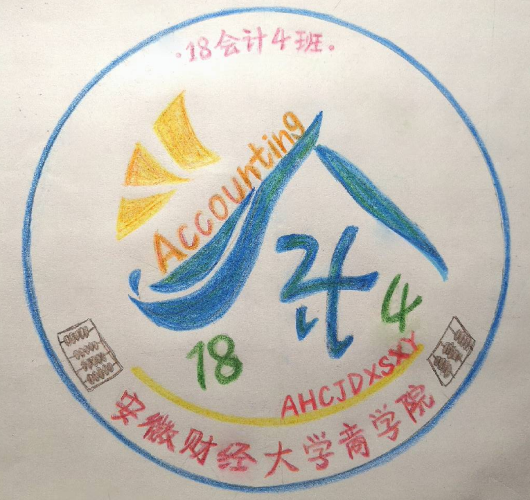 班徽整体以“会计”二字为表达点,具有专业特征。下方左右各一算盘既表达了对古代劳动人民智慧的尊重,又具有对称美。中间以蓝、绿、黄为基色象征了我们18会计4班对事认真,内心稳重,并且积极向上。蓝色部分以巧妙的结构代表了“会计”这个专业,绿色部分则是班级,蓝色的左半部分是一个瓢的形状,盛满了Accounting的水,我们18会计4班饮水思源,团结一心,怀着对班级的热爱,共同向美好的未来努力!