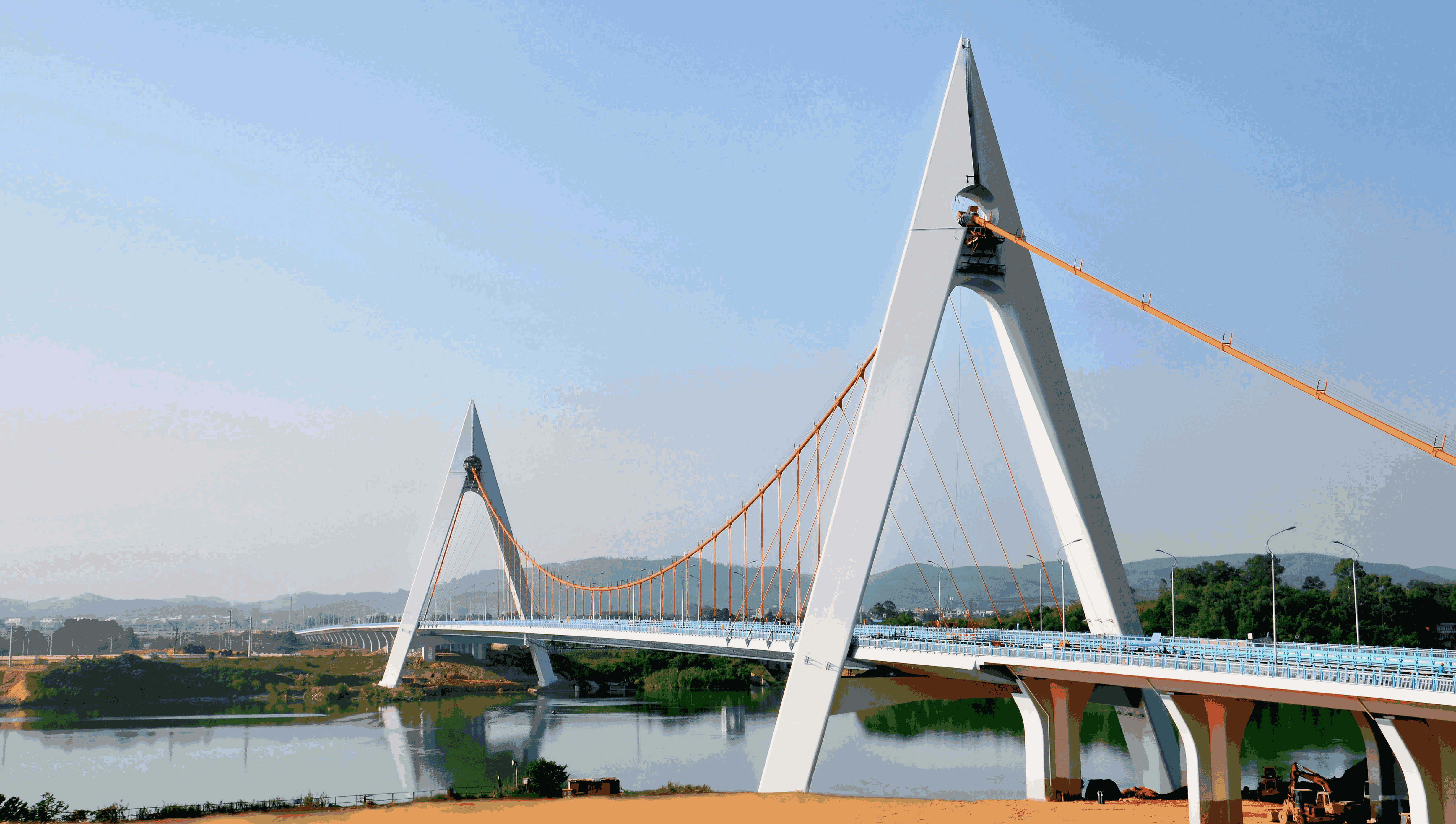 40+430+40米单索面悬索桥,2012年建成。国内首座单主缆斜吊杆地锚式悬索桥,全桥总长1937米,其中主桥长510米,为钢箱结构,主跨430米一跨过江;主塔为A型三维变截面钢箱结构,高达105米,垂跨比为1/9。本桥由四川省公路规划勘察设计研究院有限公司设计。