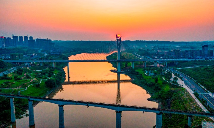 2019年8月19日拍摄的四川泸州沱江六桥。沱江六桥起于酒城大道至马屋基立交,止于蜀泸大道立交,全长约4公里,主桥主跨为200米,索塔高150米,索塔上的15对斜拉索,由“Y”字形钢砼结构组成的独特酒杯造型,设计车速每小时60公里。是连接城西和城北重要通道。