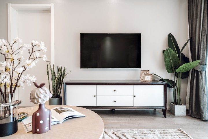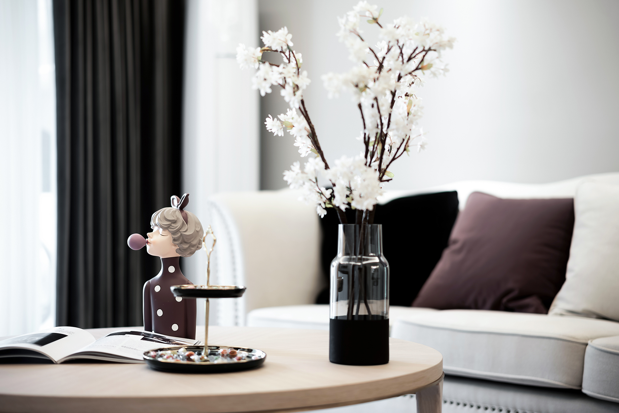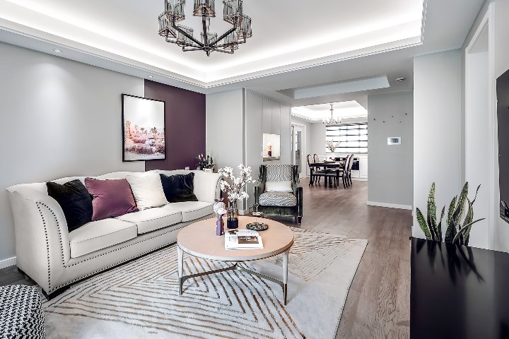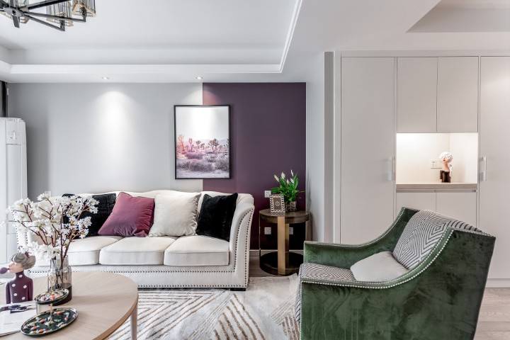 客厅设计融合了对美式与现代的梳理与吸纳。简单的灰、紫撞色拼接的背景墙,米白色约瑟美学的三人位沙发,内部是实木框架,面层是进口布艺再搭配边角精致的铆钉装饰,