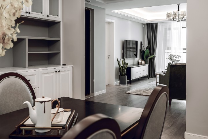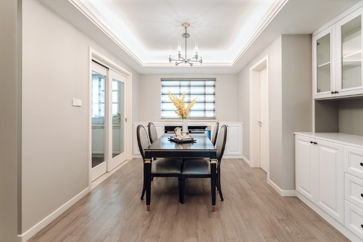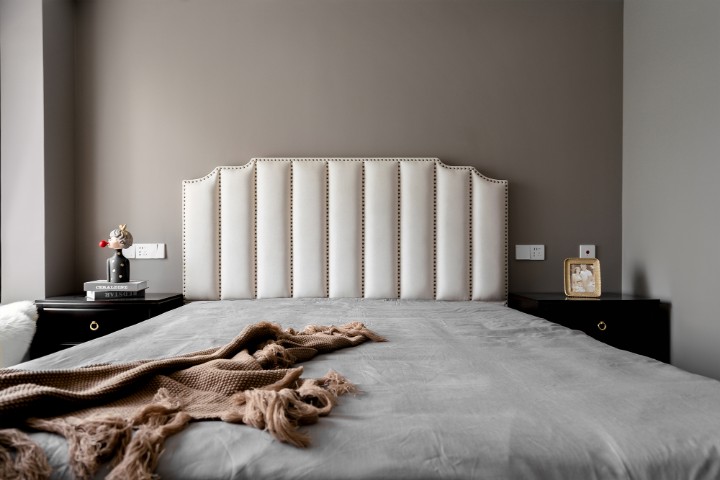 餐厅的整体空间比较方正、对称,不管是橱柜还是吊顶线条感和立体感都非常的强,深色桃花心木的四人位餐桌舒适又自在,满足了业主一家三口的日常用餐。桦木加进口环保棉麻的餐椅造型圆润,也很显档次。主卧,延续公共区域的基调,美式与现代浓缩其中,并以淡灰色为主色调,营造轻松与愉悦的空间氛围。床和沙发是同一色系、也同是铆钉元素进行点缀,在大飘窗上铺上一个白色绒毯,打造一个休憩、阅读的天地,让生活更加闲适自由。