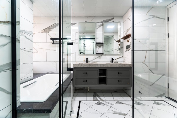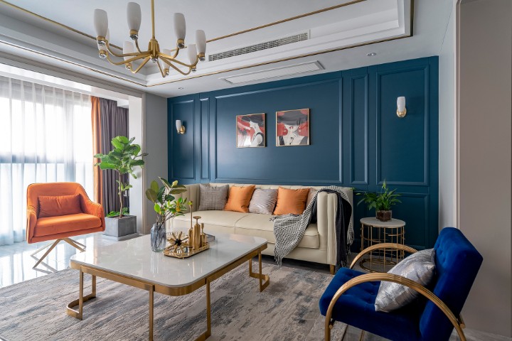 入户第一眼便能感受到其中的气派敞亮,藏蓝色的护墙板背景墙时尚大气,搭配米白色的家具和爱马仕橙的抱枕和座椅,色调协调美观、动静皆宜。