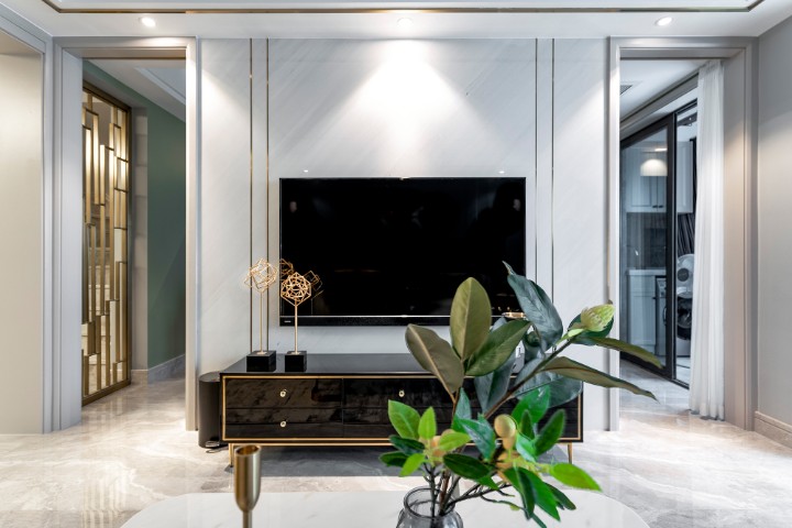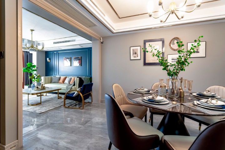 这是一套富春新天地的美式轻奢风格的实景案例,在蓝、白的优雅气质中融入轻奢质感,加以惬意的氛围营造,整体风格舒适安宁不失格调。主要居住人口是一家三口,幸福的家庭生活在此开展而来。