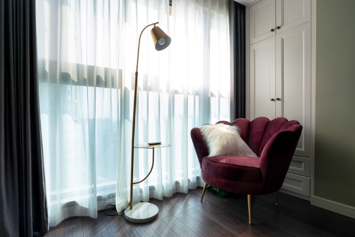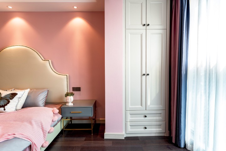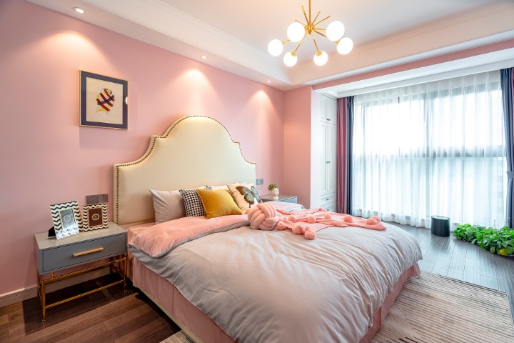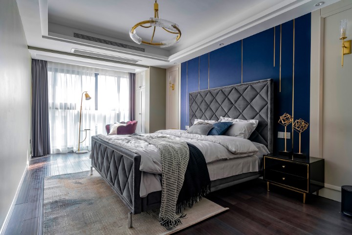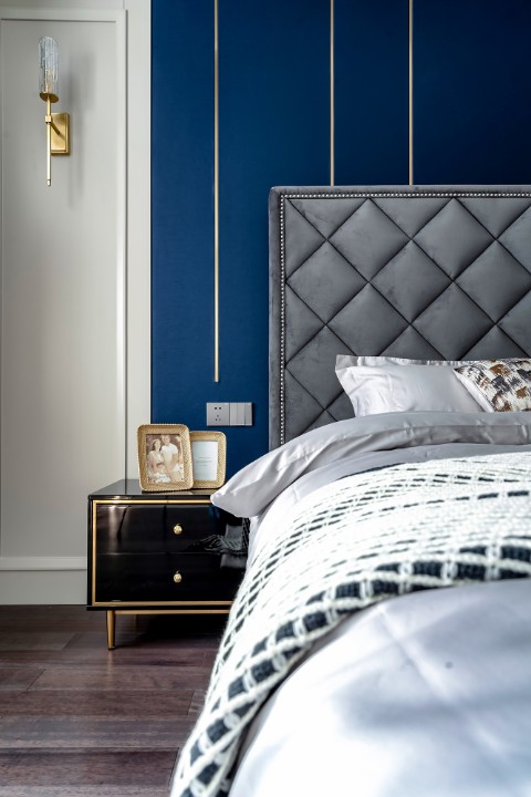 卧室集中于二楼,主卧用藏蓝为背景墙打底,金色金属线条进行装饰,和客厅的沙发背景墙形成呼应,避免上下色彩产生分离。
