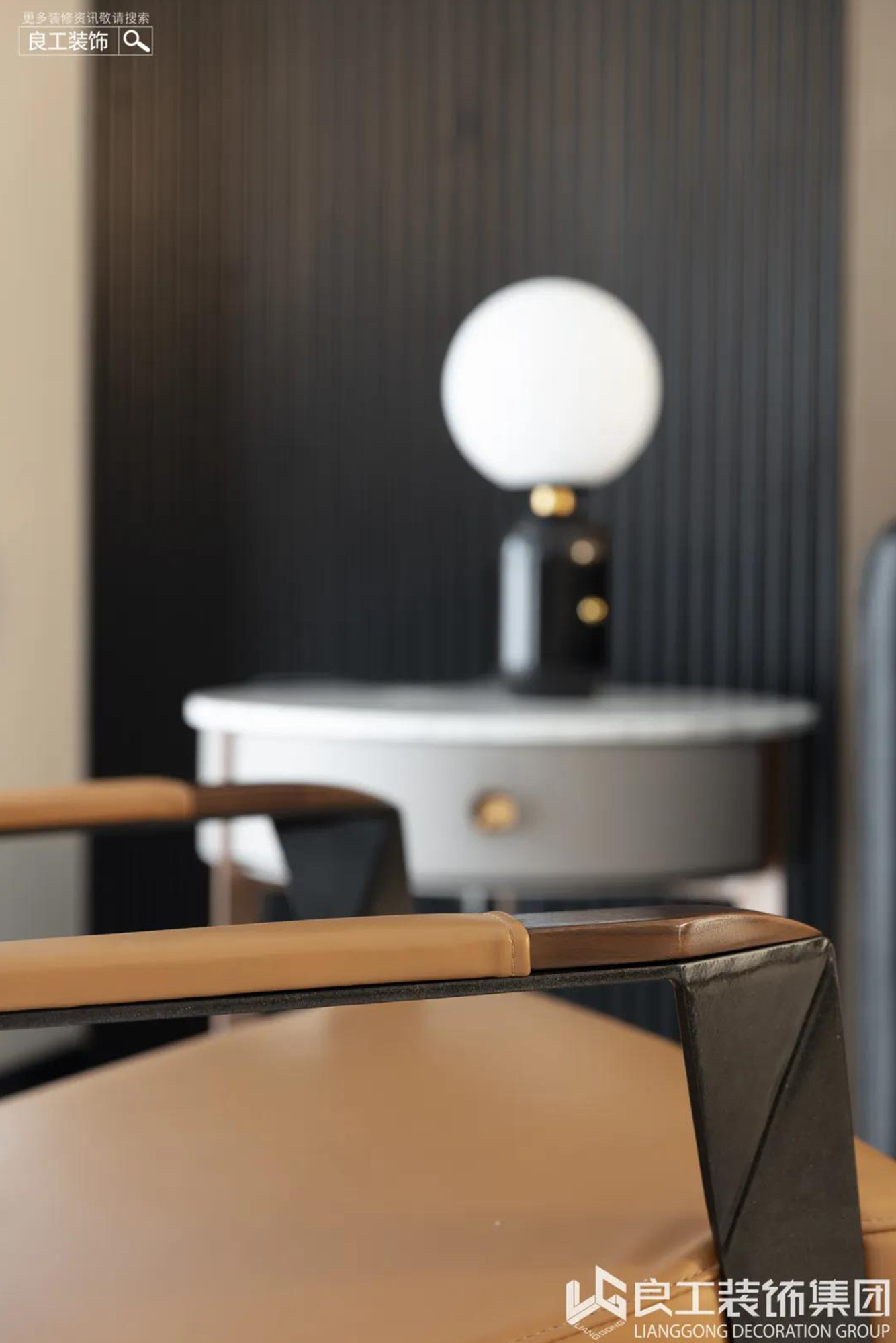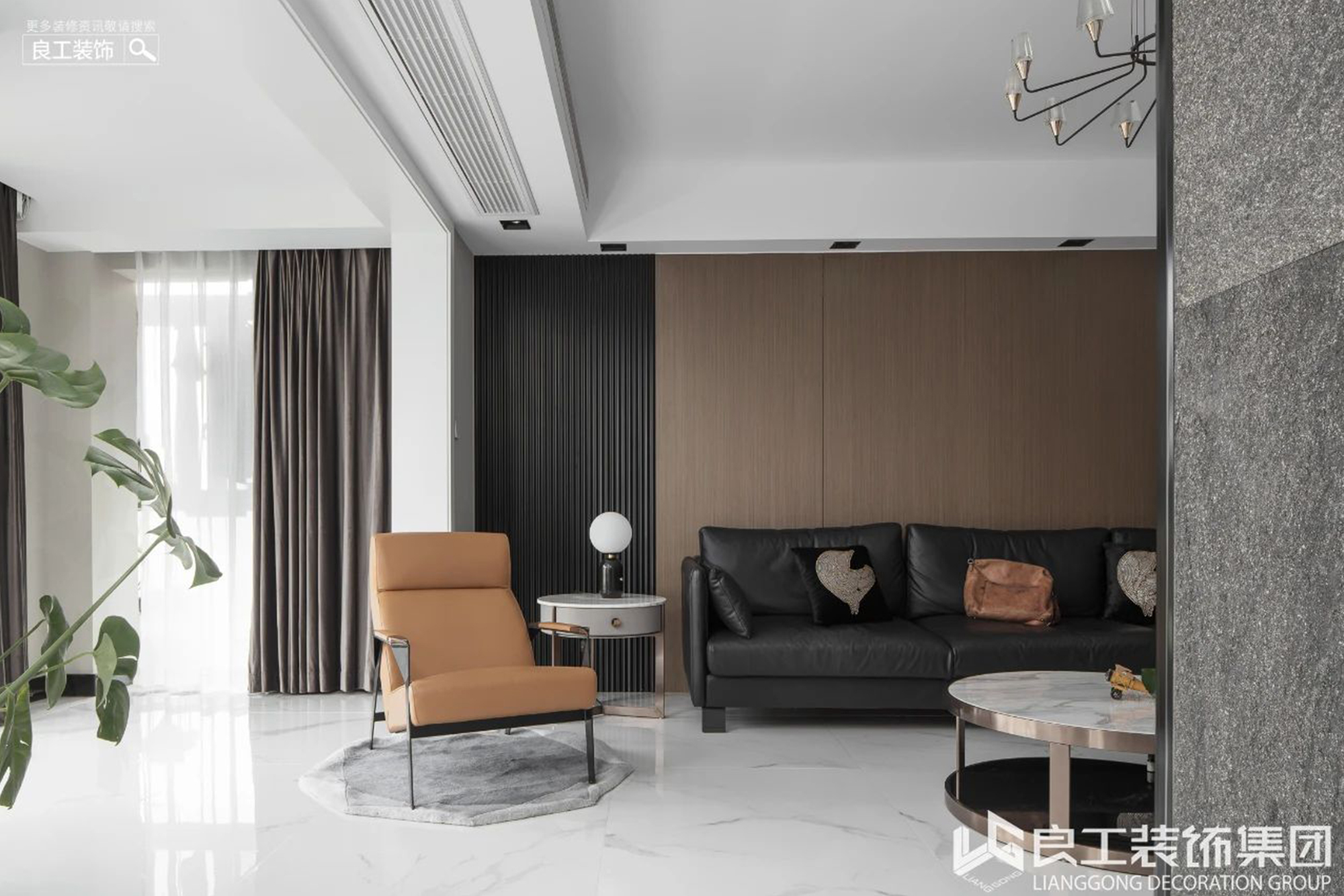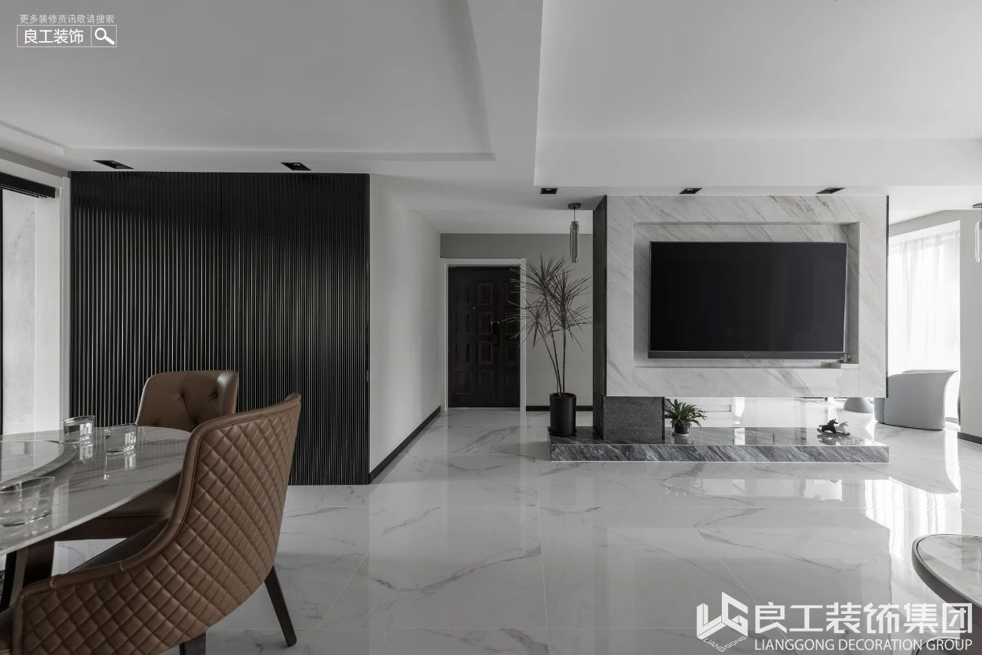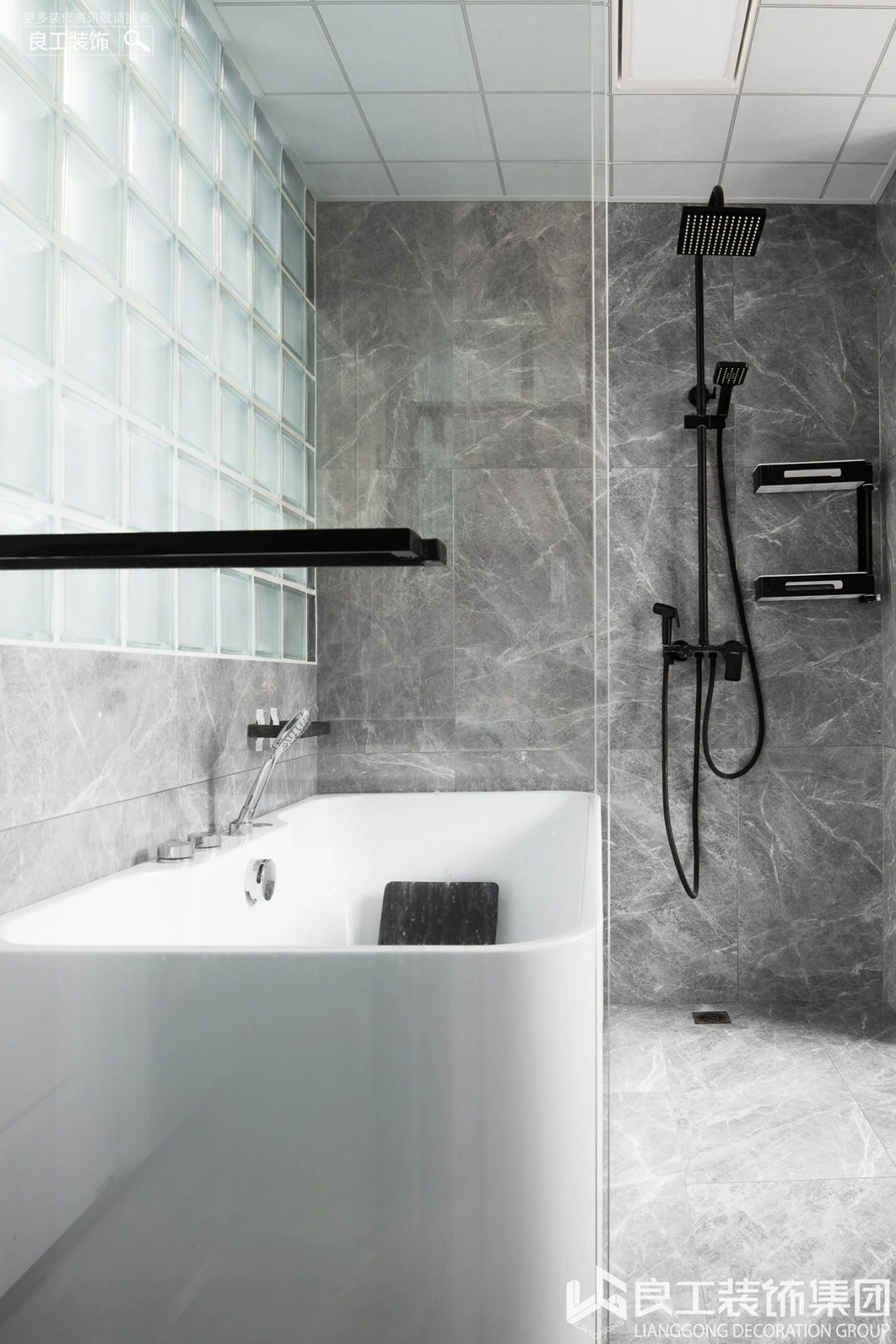 本套是俩套打通的,业主作为婚房使用,家人都喜欢明亮的空间,简洁的线条以及黑白灰的配色会展现出沉稳的美感。黑白灰要展现出质感和它的张力,电视背景用独立的石材和黑色的岩板相搭配,沙发背景运用波浪板和木饰面,让整个客厅流线自然通透,简约雅致,不过分而无不及,放眼望去皆是对生活的情感表达,空间的简洁性,构造的清晰度和材质的纯粹度,成为空间美学的载体。房子的每一处看过去都悠然自得,卫生间的双台盆和浴缸的存在都是对回家后的放松,享受生活的宁静和美好。