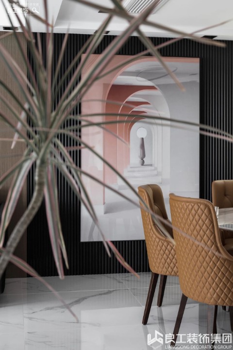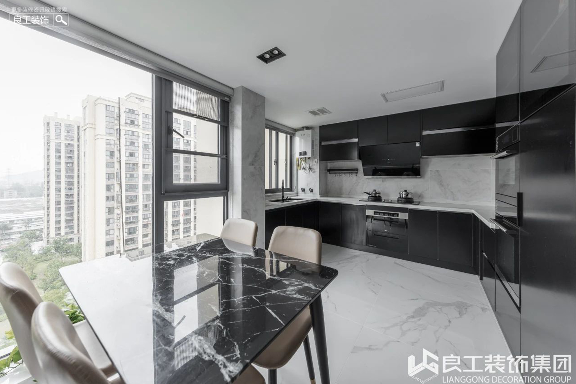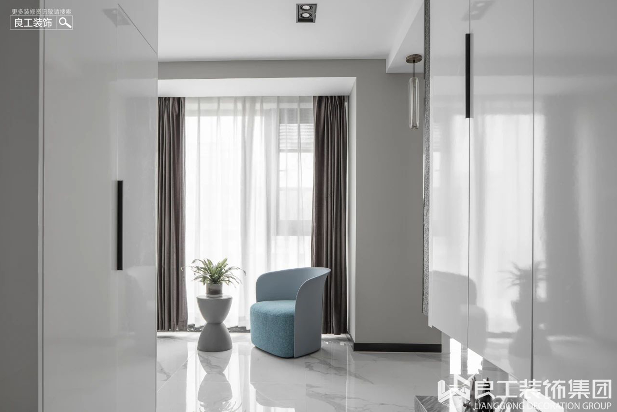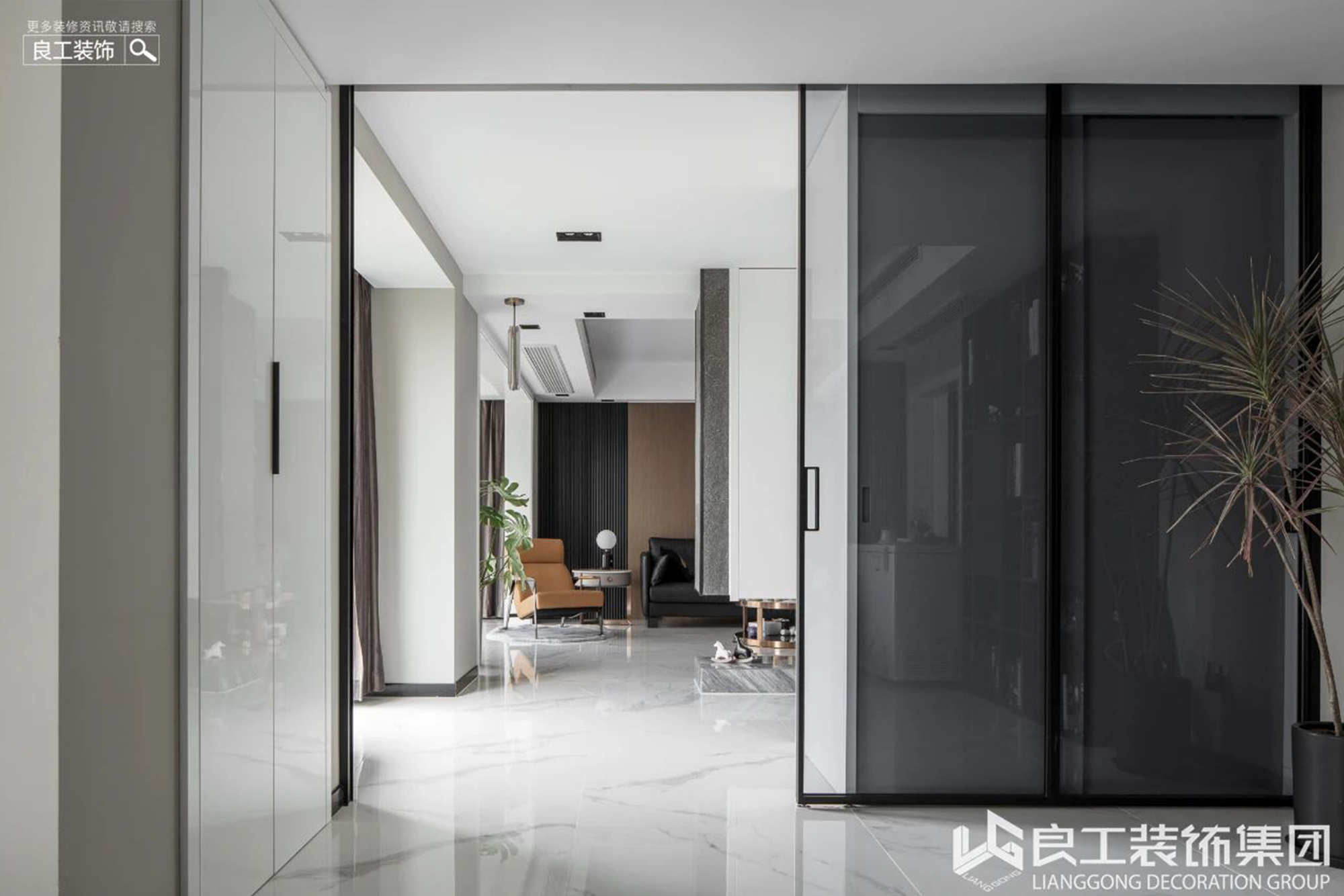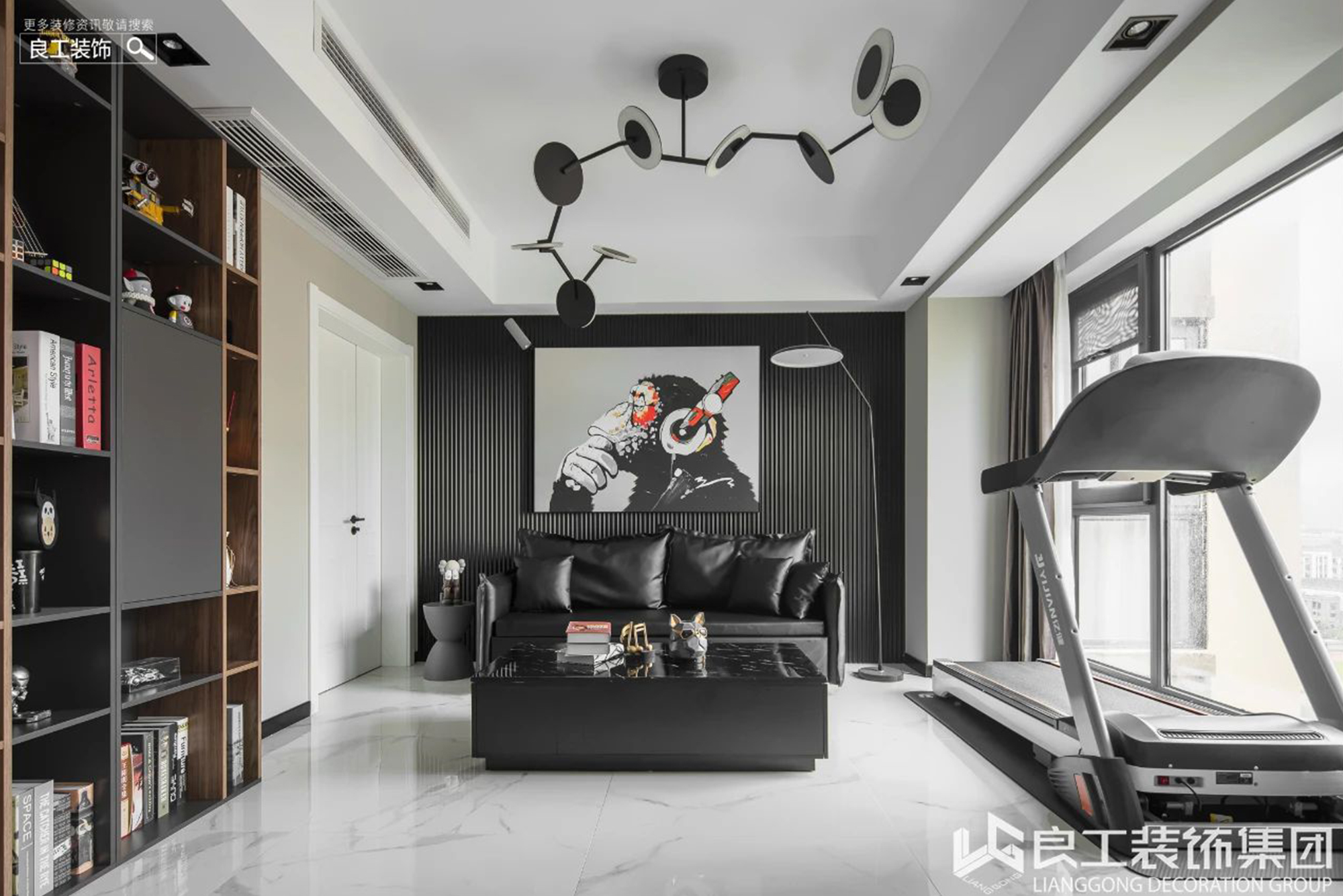 本套是俩套打通的,业主作为婚房使用,家人都喜欢明亮的空间,简洁的线条以及黑白灰的配色会展现出沉稳的美感。黑白灰要展现出质感和它的张力,电视背景用独立的石材和黑色的岩板相搭配,沙发背景运用波浪板和木饰面,让整个客厅流线自然通透,简约雅致,不过分而无不及,放眼望去皆是对生活的情感表达,空间的简洁性,构造的清晰度和材质的纯粹度,成为空间美学的载体。房子的每一处看过去都悠然自得,卫生间的双台盆和浴缸的存在都是对回家后的放松,享受生活的宁静和美好。
