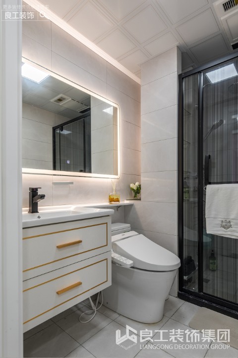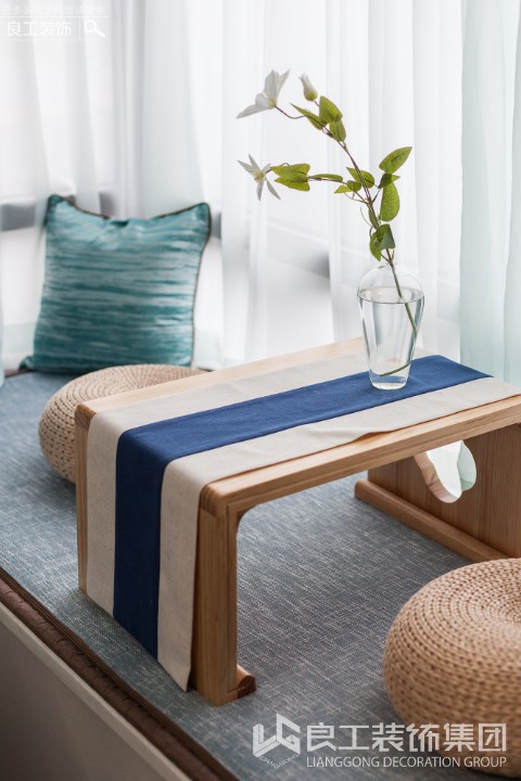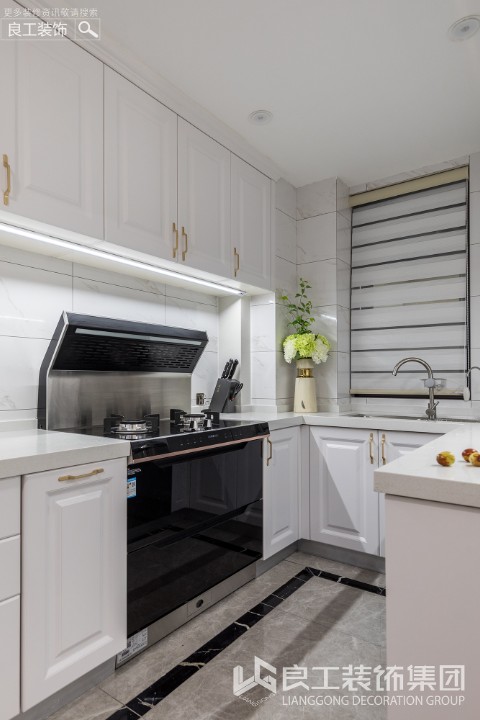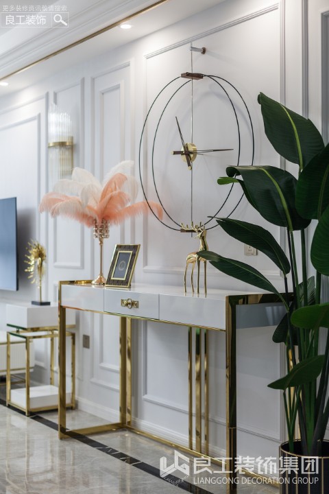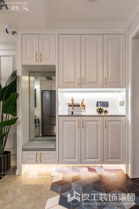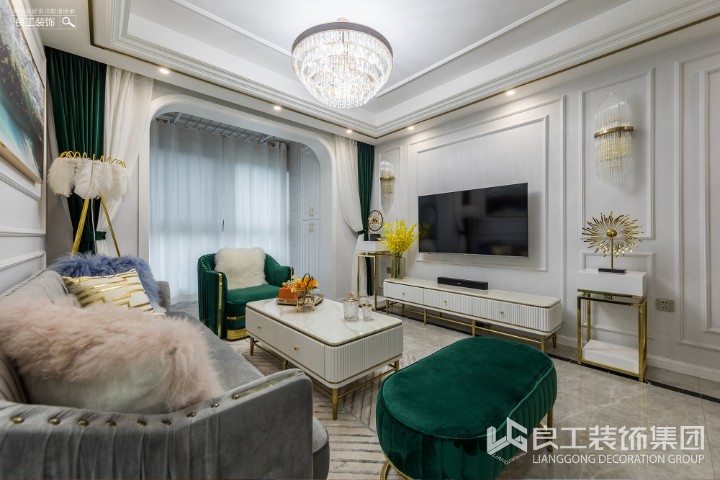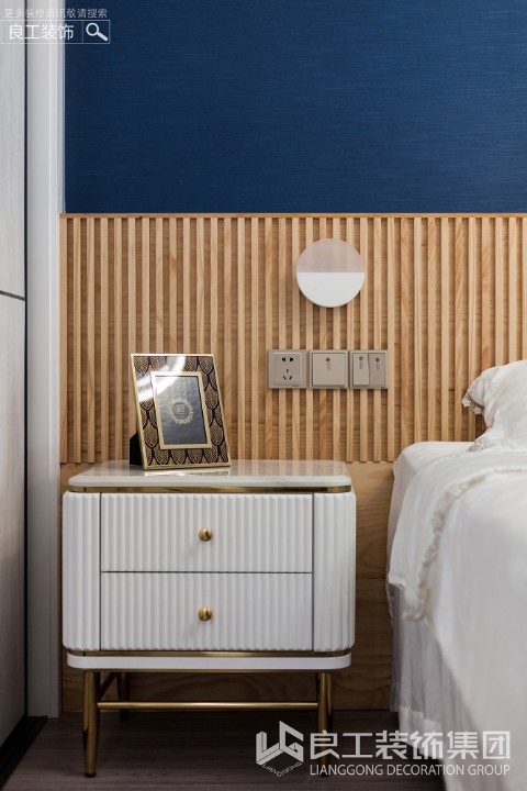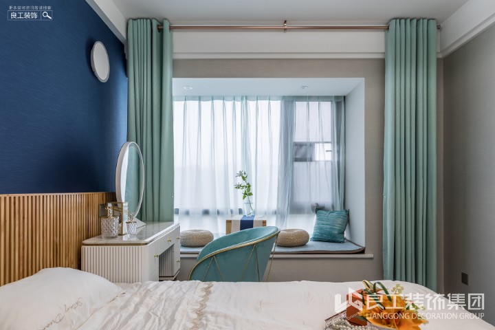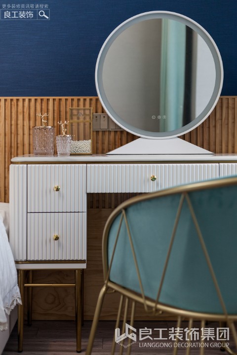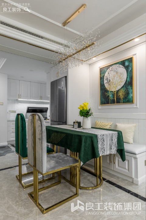 这套案例之中,女业主喜欢全屋亮堂通透的感觉,因此客厅与阳台做了打通,不仅在视觉上延伸了客厅面积,还增加了采光。以一扇美式拱门作为巧妙隔断,简约温馨又带点复古的味道。白色作为美式风格的传统打底色系,令空间清爽明朗,简洁明快,白色地毯配合着墨绿色沙发,这抹自带贵族气质的色彩融入空间后,瞬间起了惊艳的化学反应,家充满沉静、复古、雅致的韵味。灰绿色的窗帘布艺也在这种格调中显露出了相呼应的一面。蜂蜜色金属搭配,增添了生活气息,却不染俗气。绿色与白色灰色排列组合,克制又规律的展现出细致的精准美感。规律直爽的线条背景墙紧密配合着吊顶线条,地面铺砖,巧妙达到了一份无限延伸的空间美感。深谙美式与轻奢风的搭配之道,巧妙运用金属、皮草、大理石、丝绒等元素,以点、线、面等不同形式去平衡融合,让不同维度的艺术张力倾泻蔓延,留下一室的小资情调。餐厅空间选用了一字型卡座+2把普通餐椅的模式,这种组合形式不仅节省空间,还提升了利用率与实用性,同时也让餐厅整体格调更易彰显摩登与雅致感。无论是烟火气十足的日常中餐,还是格调满满的西餐小聚,抑或是入夜时的微醺小酌,都令人心驰神往。空间的现代质感在卧室得到了延伸,简洁的线条勾勒出回归本质的初心。考虑到卧室的静谧需求,在设计配色上极尽克制。不同饱和度的蓝色系深浅呼应,成功塑造出一个舒压、宁静的休憩氛围。主卧背景墙面的设计堪称这个空间的一大亮点,灵感来源于女业主曾经到过的一间民宿,那里自在、安宁的氛围给她留下了深刻的印象。将这种氛围搬入主卧的设计中,黛蓝色墙纸搭配栅栏式的木色半护墙板,氤氲出一份静谧与安然。
