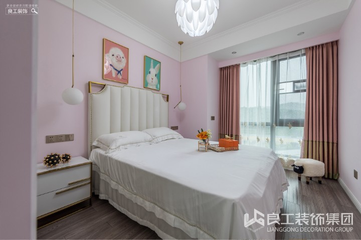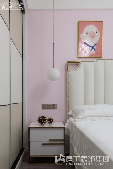 女主人希望拥有一个自己的衣帽间,所以将主卧的卫生间舍弃,做成了一个衣帽间,满墙的收纳衣柜很好地满足了她的需求,也是她很满意的一个设计点之一。次卧做成了儿童房,浅粉色的墙面搭配乳白色吊顶,甜而不腻,充满阳光和温馨感。