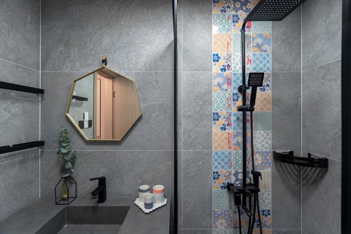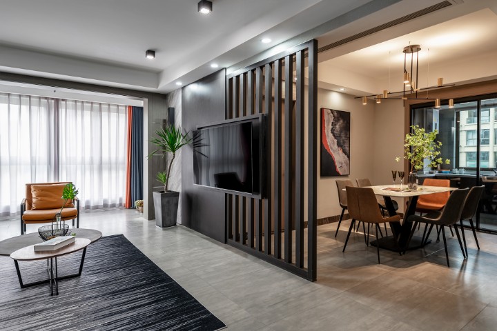 客餐厅空间没有互动,把电视背景用木格栅和石材做一个拼接,第一是加大了整个电视背景的层次感,第二是让客餐厅有融为一体的感觉,客餐厅地砖采用600*1200大砖铺贴,让空间有延伸的感觉,主卧通过把衣柜设计到床对面内嵌,加大收纳功能,更加美观,男主人和女主人衣物分开收纳,厨房通过打通,让厨房台面增大,以后家人一起做饭的氛围更好!卫生间台盆选择的是一个定制台盆,哑光面的材质和整体的亚光砖搭配在一起,让整个空间高级感直线上升!