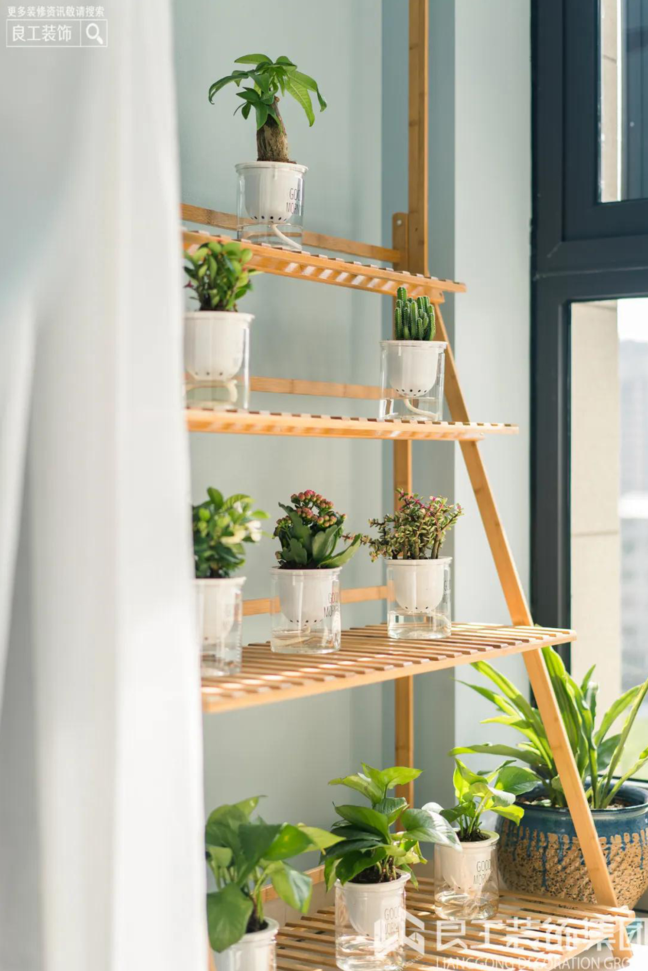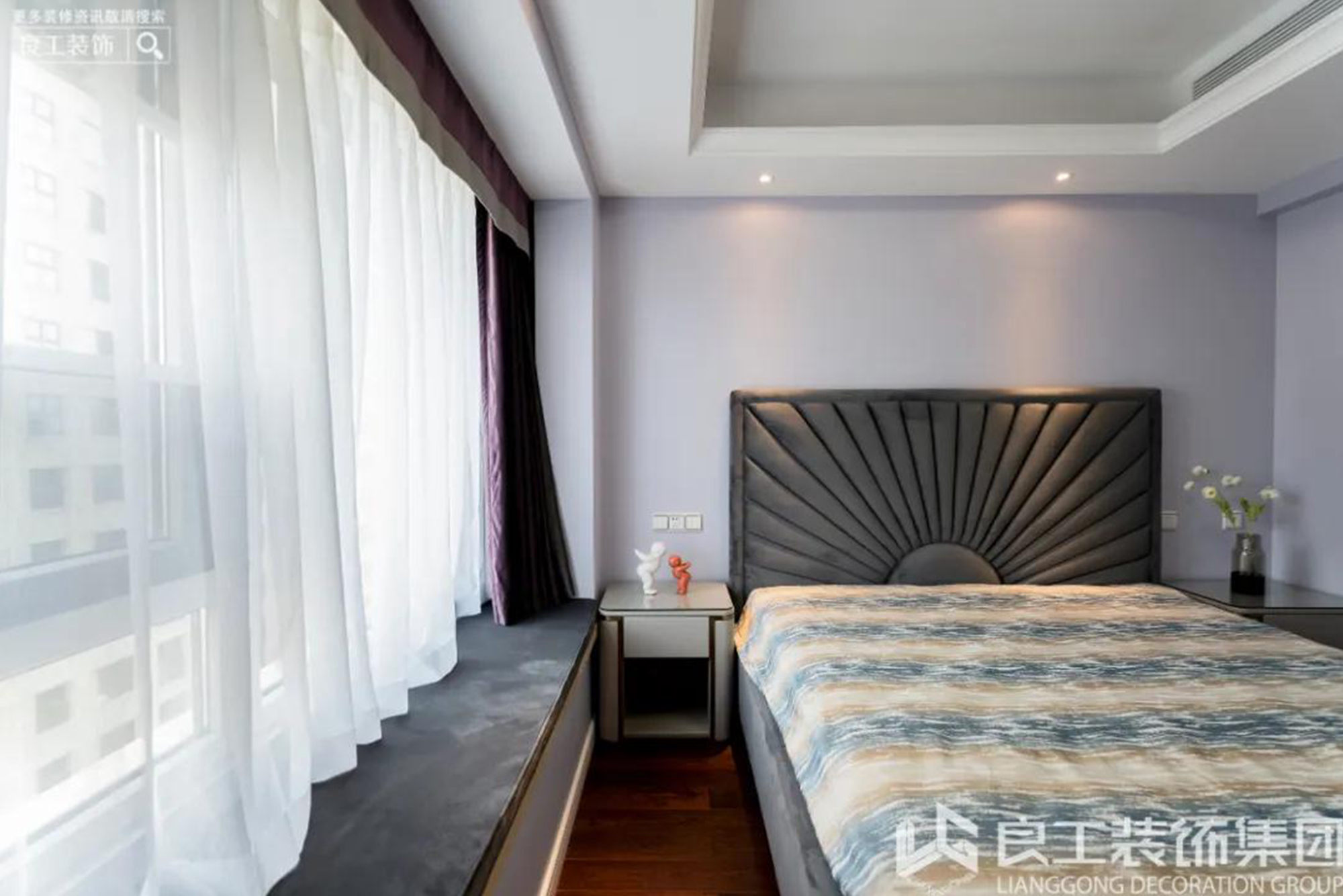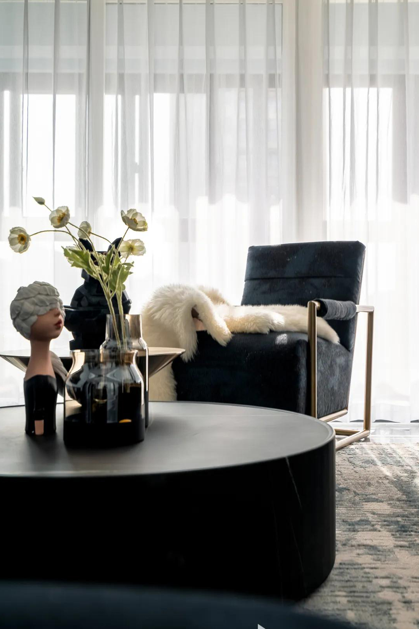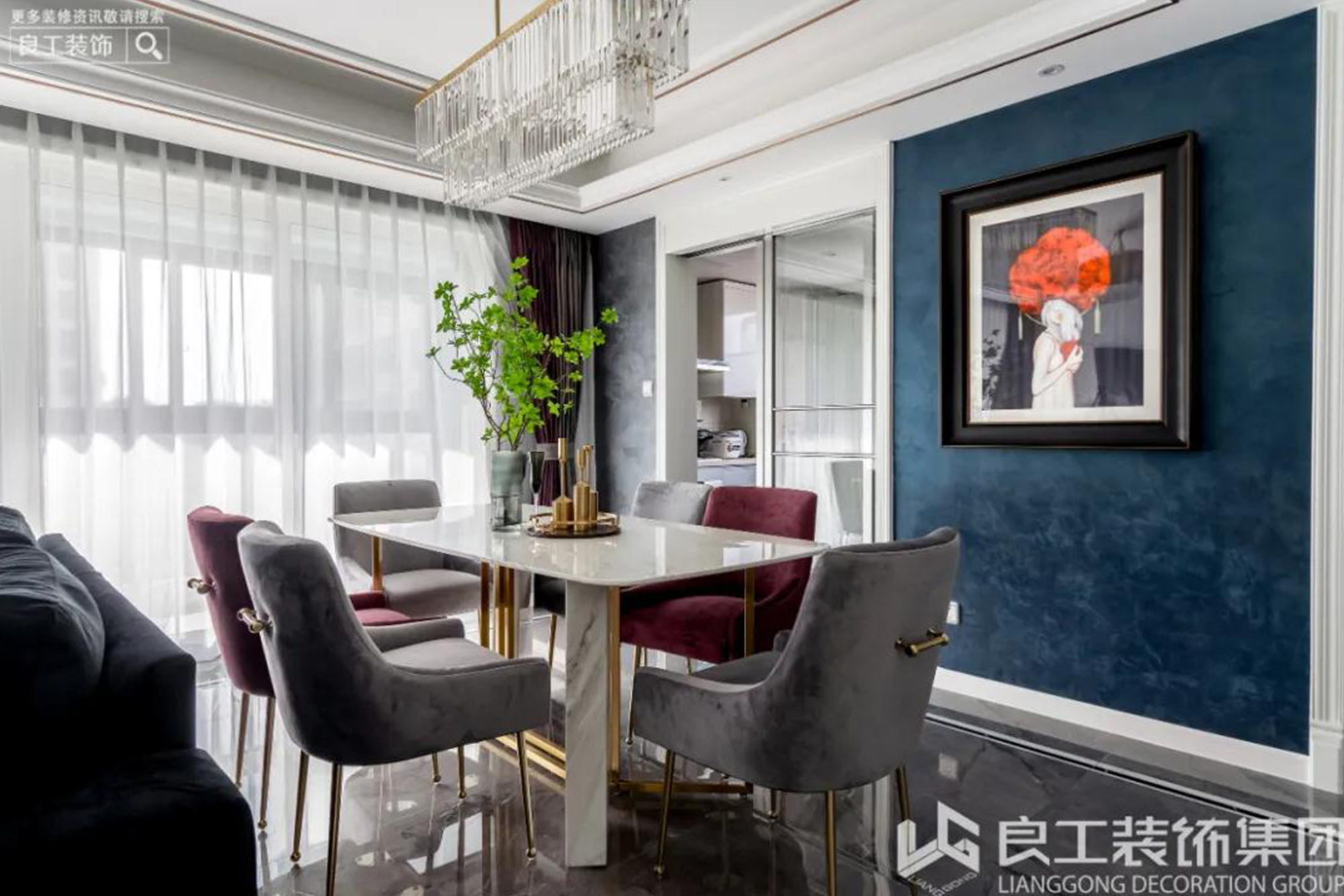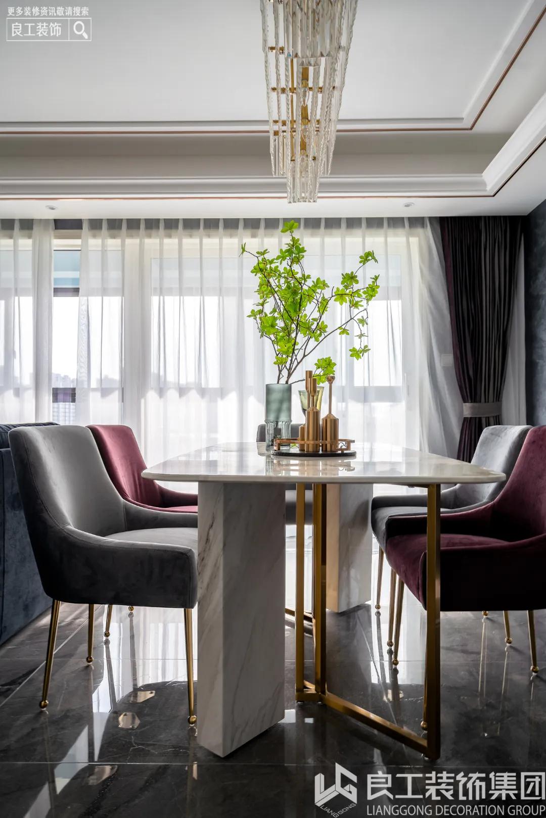 大面积的落地玻璃给人以宽敞、明亮的视觉感受。整面的纯白纱质飘窗,创造室内明媚光景。随着光线的移动,会客空间呈现出明暗相互交织的的景象,带来无限神秘感与惊喜感,让家充满了时光的轨迹。餐厅和客厅是联通的,越过沙发便是餐厅,黑色和灰色的色彩搭配让两者成为一个整体,爵士白大理石纹理餐桌与客厅背景墙两相呼应,加之简约线条的金属与玻璃吊灯,简约轻奢的气质由此被勾勒出来。花纹大理石桌面、造型不同的高脚杯,实用方便还不失特色。餐厅温润的大理石餐桌搭配沉稳的灰色、优雅的红色、具有高级感的金属线条以及挂画呈现的是时尚精致的环境;清脆酒杯之间,碰撞出浪漫与贵气。餐桌椅的造型简洁、圆润,金属的餐椅包角从细节上呼应了轻奢的调性。金属与玻璃元素的吊灯、黑色软皮质沙发、雅白大理石餐桌,既有轻奢感又具备现代设计感,再选用灰、白、红软装的搭配,点活了整个空间,即使久居也不会有乏味感。金属线条、简约色调是户主家的核心元素,简洁的空间代替复杂的元素,精致的软装元素凸显着独特的空间质感与别致的生活品位。