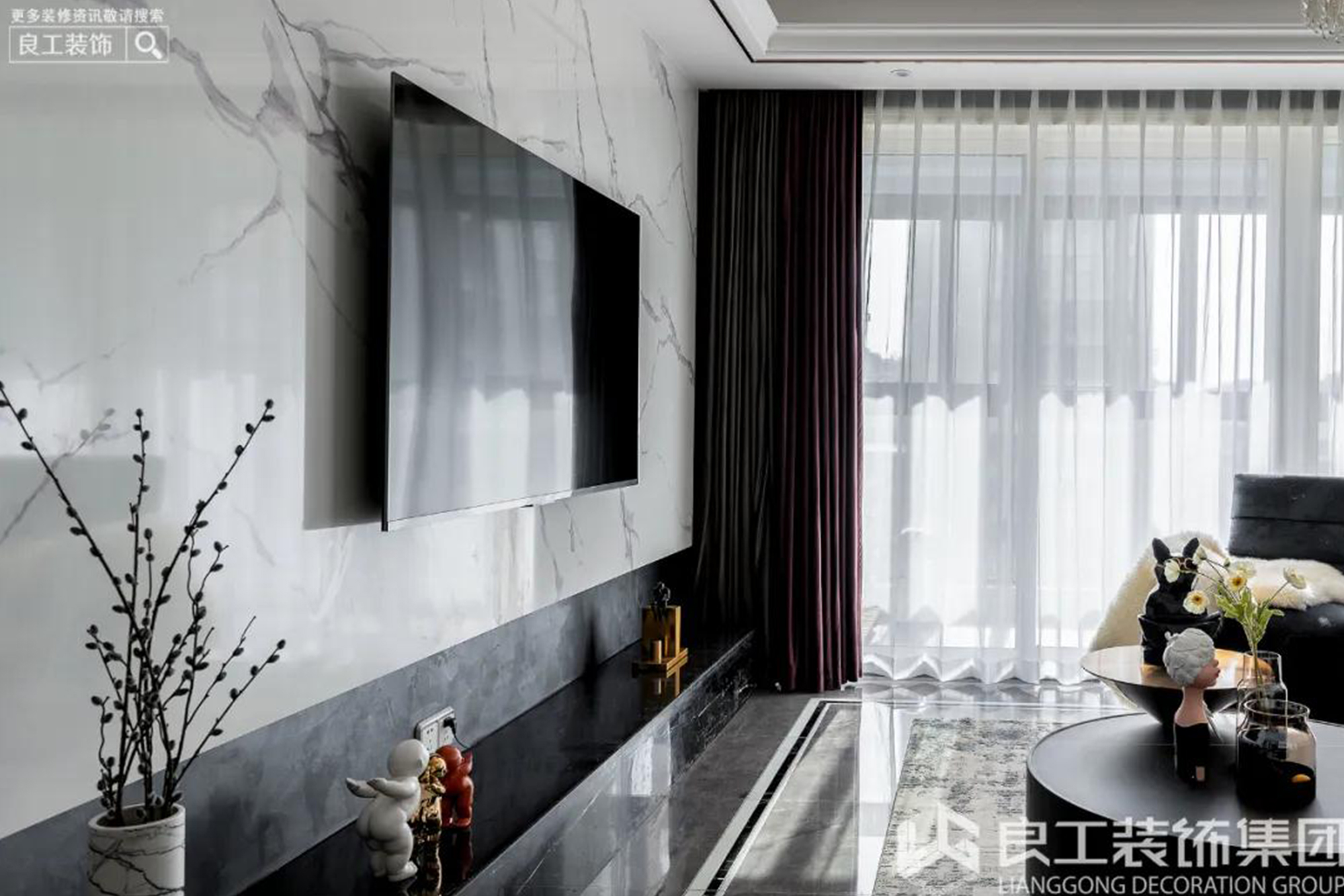 ——以黑、白、雅灰为主。大面积的爵士白大理石壁面加上简约线条的空间设计,给入户者的第一印象:简单大气。会客厅是整个家的中心,整体黑灰白的配色与电视背景墙呼应,搭配简约的现代家具和新潮趣致元素的软装,让简约的空间尽显品位。树脂雅黑桌台和金属线条相融,低调却不单调
