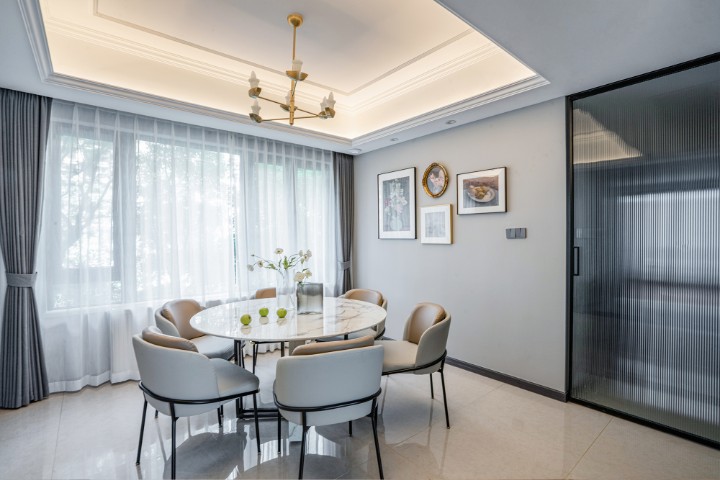 本案是杭州的精装房,原先的硬装是比较老气的美式风格,暗红色的房门和地板,灯具也是比较土气的水晶灯,原客餐厅是直通的,浪费空间比较大,后期在进门处隔了一个储物间和玄关,所有的房门颜色都进行了改色,与木饰面做成了一体色,整体墙面都做了艺术涂料,使空间看上去更加饱满和明亮。