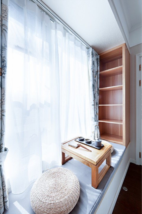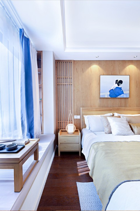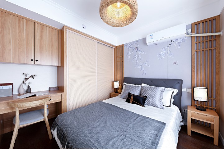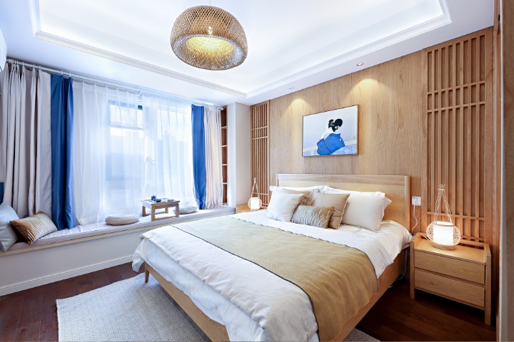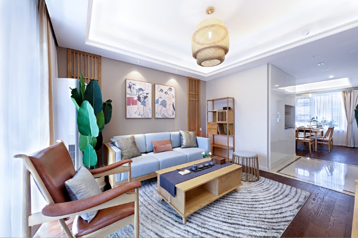 客厅:客厅用冷色调搭配原木色家具,2130*900*880尺寸的棉麻灰白蜡木沙发,色系纯度低、整体干净利落。选择深浅色线条交替的地毯来弱化深色地板带来的沉闷。藤织吊灯呼应了整体,让空间充满了原生质感,填充了纯白吊顶的空白。沙发背景墙两侧选用木质栅栏装饰在视觉上清新简洁,连接了上下空间的同时还秉承了日式的特性。
