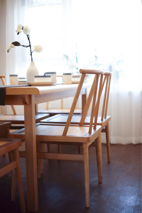 餐厅:餐桌椅以及餐边柜都是良工软装部定制的白蜡木实木家具,整体的原木色彩舒适自然,侧面的餐边柜可以隐藏平时用的多余物品,在上面放上一副艺术挂画、精致的花瓶把墙面空间装点的精致美观。