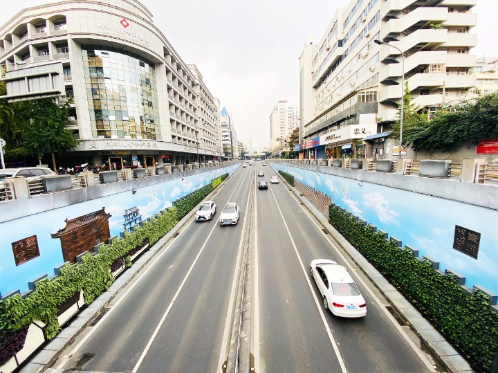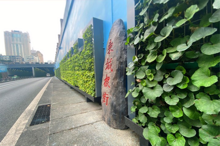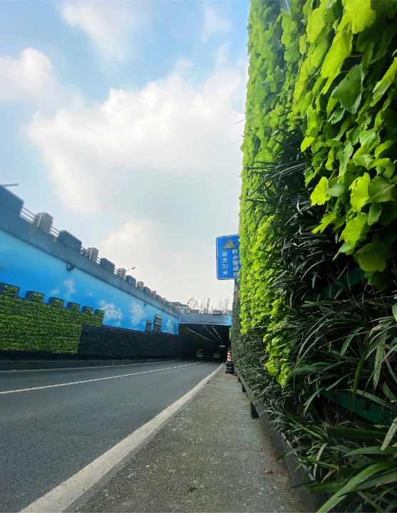 建设思路:该项目以川西风貌以及成都东城根老城楼、城墙元素为主题背景,运用模块化植物结合浮雕元素以及墙体彩绘构建了隧道出入口的立体式绿植景观墙体。利用城市主干线隧道出入口大块面白墙,运用固态土壤技术进行垂直绿化,结合智能滴管系统自动监测,并进行水肥自动化管理,最大限度地利用城市边角,美化营造有生命的城市景观。
