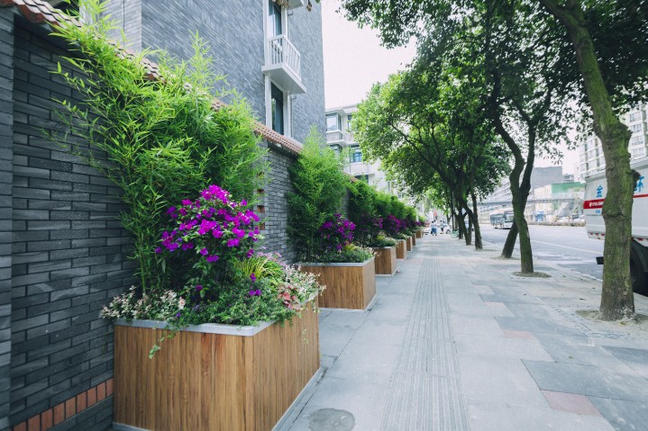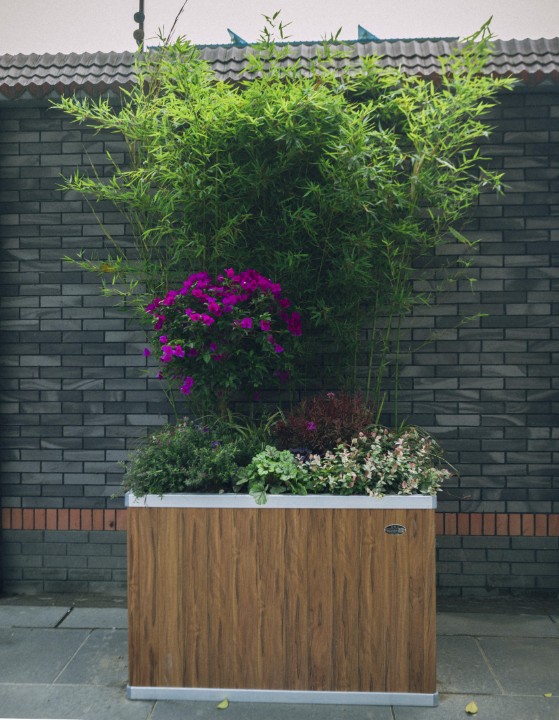 建设思路:原有灰色砖墙延伸成一条古朴的时代长廊,一侧栽植行道树,人行通道宽约5m,比较适合在墙边进行景观打造。现结合每一块墙体中央位置摆放1.2×1.2×0.8m铝制镶边仿木花箱,以人面竹作为屏风隔档,每组花箱栽植有三角梅、花叶络石、矾根、满天星、红血树、绣线菊组成花境,整体风格青翠雅致。每一个墙边自成一景,沿步道一路行来,花箱与砖墙融为一体,为单调的橙瓦灰墙增添了一抹亮色。