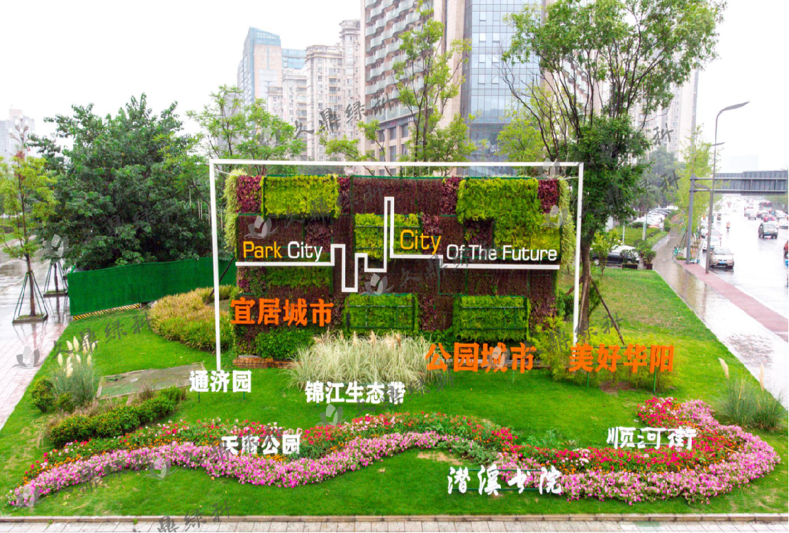 建设思路:项目位于两条道路的交汇处,车流人流量大, 是一个极佳的城市区域名片展示区,项目为植物绿墙+花镜的组合,鲜艳的花卉搭配沉稳的绿墙,让人眼前一亮。 井且充分考虑此处的流量,把此处当做华阳的名片展示区。通过空间植物的变化营造开合有序的植物景观,疏密有致,自然清朗,体现开敞疏朗的植物景观为主,丰富视觉景观。