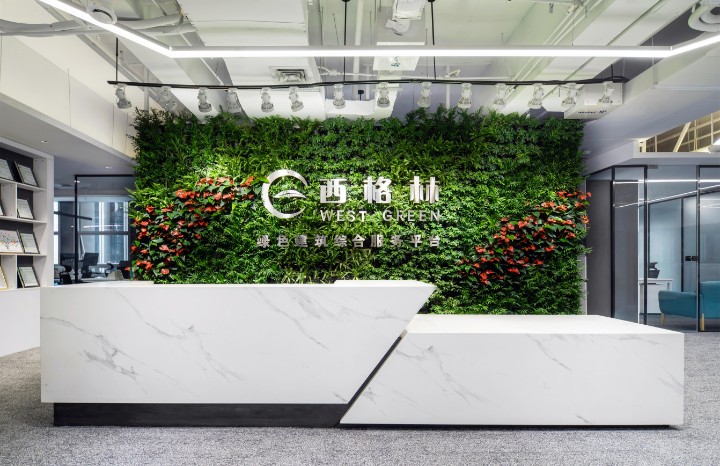 建设思路:基于WELL健康建筑的高要求,westgreen office 结合实际情况,在入口处搭建5808mm*2900mm的立体植物墙。在办公空间中融入美观、令人愉悦的自然亲生命元素,既契合绿色健康的理念,又让员工足不出户就能贴近自然,可有效提高情绪的共鸣与幸福感,立体 植物墙成为西格林向客户和员工传递视觉温度的最佳载体!