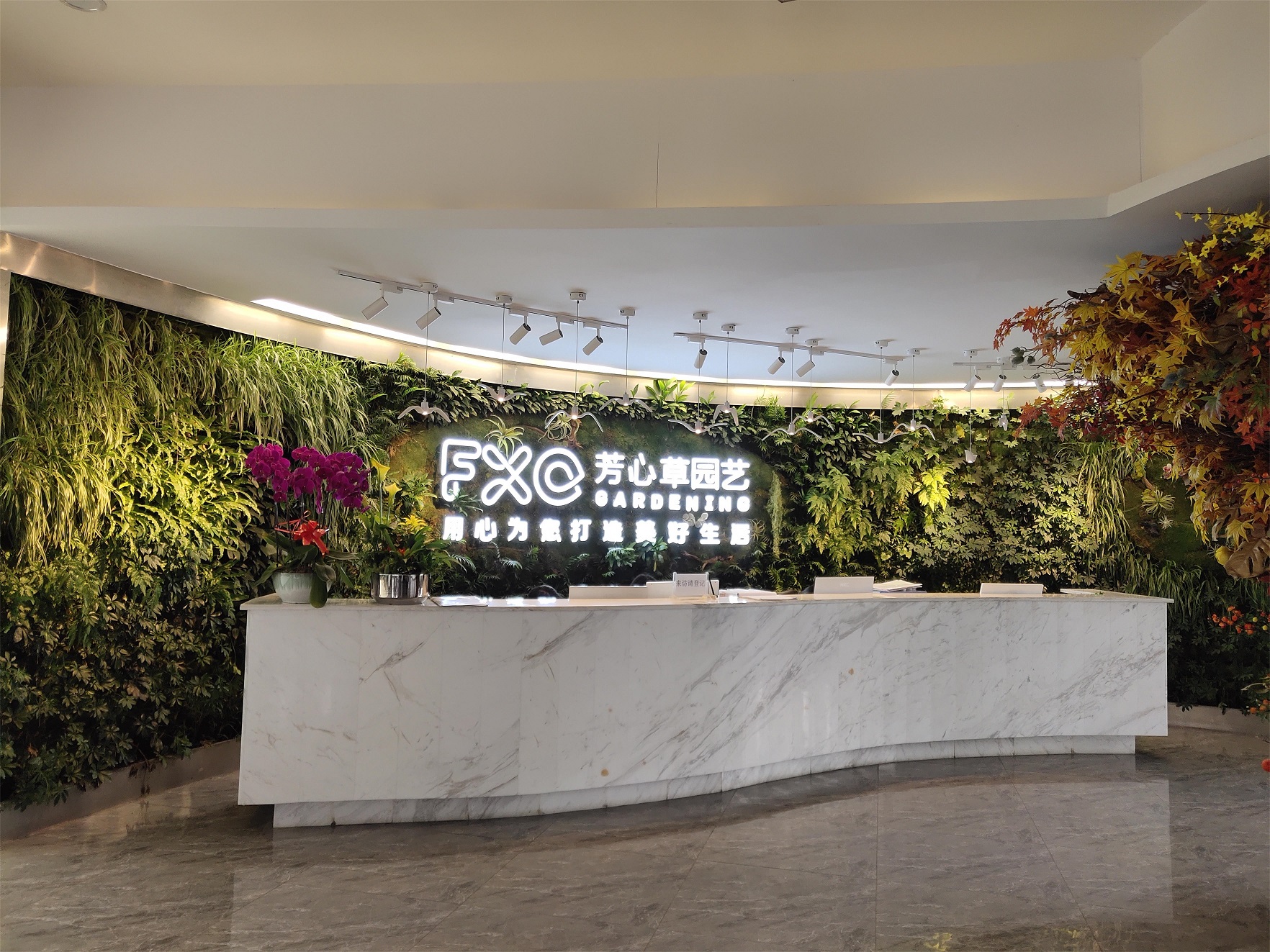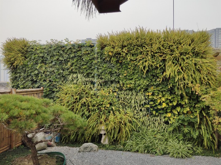建设思路:为打造符合园艺公司氛围的公司环境,我司在有限的环境当中尽可能的打造较为绿化丰富的工作环境。首先是我司前台背景植物墙是和永生苔藓结合的弧形绿植墙,同时因是室内植物的选用是较为耐阴的植物: .帆风顺、 鸟巢蕨、 银线蕨为主。 鸭脚木、金边吊兰为室内外绿植墙优选的植物品种。同时还添置了补光灯,来保证植物在生长过程中需要的光照。