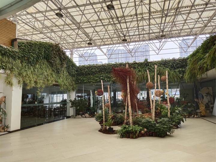 植物品种:肾蕨、金边吊兰、鸭脚木、红花继木、春羽、天门冬等。