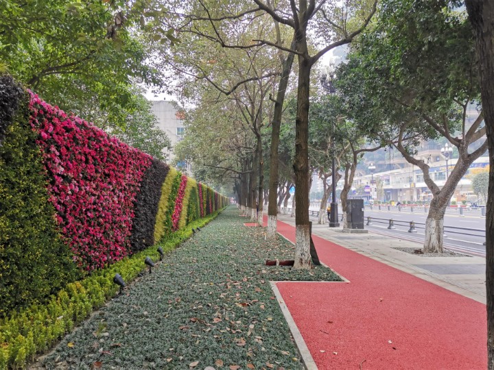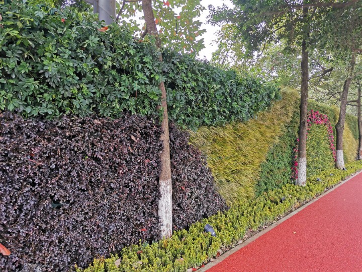 建设思路:此次金光路北侧景观提升按照《成都市公园城市一体化设计技术规定》、《成都市“两诉一增”生态景观建设技术指引》、《成都市特色商业街区建设指引》等相关规范导则,将金光路北侧原有老旧围墙进行立体绿化设计。立体绿化通过色系搭配,在空间上与七一森林城市空中花园、钟楼市政广场形成呼应,打造3D版公园城市场景;在功能上通过垂直绿化的布置,进一步城市绿化面积,净化城市空气,并搭配慢行绿道以及灯光效果,将自然生态与钟楼TOD商圈有机融合。景观绿墙的布置,不仅提高城市绿化覆盖率、开拓城市绿化新空间,同时进一步节约了土地资源,是未来改善城市生态环境的重要举措。