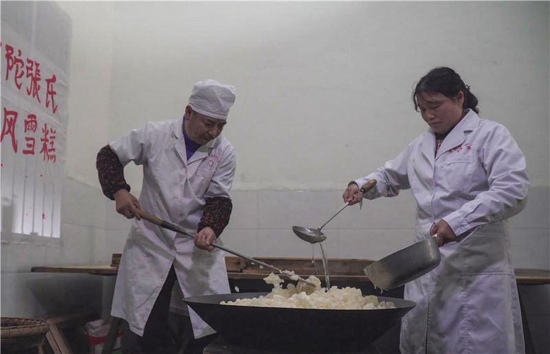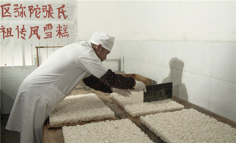 风雪糕是流传于民间的一道小吃,由“玉兰片”演变而来,其传统制作技艺起源于清嘉庆年间,传承历史可追溯至1886年(清光绪十二年),至今已有134年。作为风雪糕的原产地,“弥陀张氏祖传风雪糕”其统制作技艺已传至第四代传人。