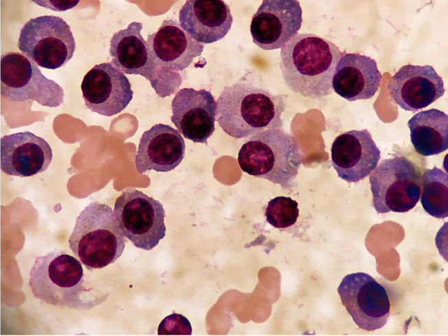 此图为清一色“骨髓瘤细胞”,胞体圆形或椭圆形,胞浆量多、蓝色、不透明,无颗粒或含少量紫红色颗粒;核圆形,居中或偏位,核染色质呈粗颗粒状,染紫红色,核仁1~2个。骨髓瘤细胞见于多发性骨髓瘤。