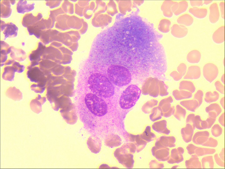 破骨细胞,胞体巨大不规则,边缘不整如撕纸状,胞浆丰富呈淡蓝色、淡红色或红蓝相间,胞质中有大量较细小的紫红色颗粒并伴有粗大的紫红色颗粒,核常多个,彼此孤立,核染色质呈粗网状,核仁1-2个。其在骨骼的发育和形成过程中发挥重要作用。