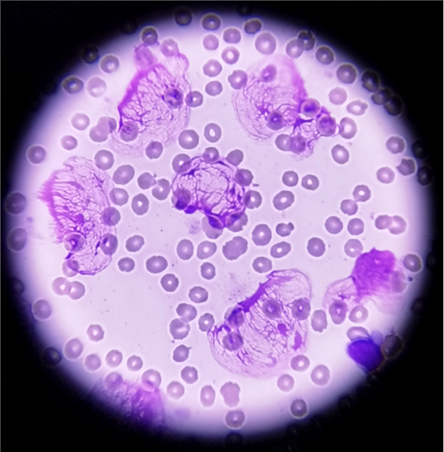 涂抹细胞(篮状细胞),慢性淋巴细胞白血病的血涂片中比较常见,这种涂抹细胞本质上属于退化的淋巴细胞,大小不一,形态各异,如在花丛中翩翩起舞一般。