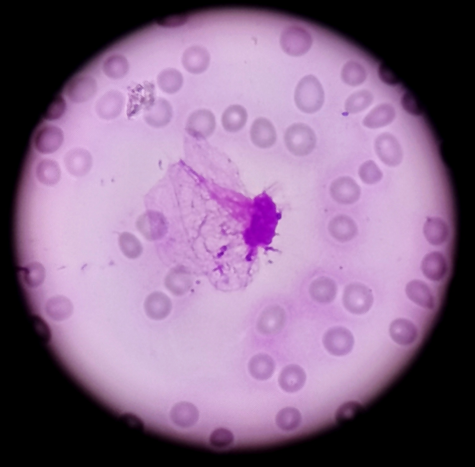涂抹细胞(篮状细胞),在片尾,较红染,像蝴蝶。