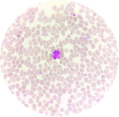 真红病人外周血涂片可见红细胞轻度大小不均,嗜多色红细胞增多,血小板明显增多,偶见一个原始细胞长得像一直小猪,被很多红细胞和血小板包围,就像一只猪迷失在丛林中。