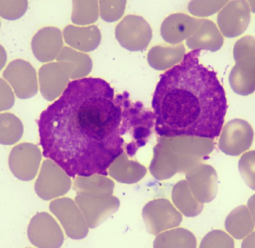 本图来自MM(IgA型)患者骨髓细胞涂片,骨髓瘤细胞核染色质疏松,偏位,可见核仁,胞浆量丰富,可见核旁淡染区,胞浆紫红色,似火焰,故称火焰浆细胞。图中两个火焰浆细胞围绕中间血小板,整体形似蝴蝶偏偏起舞;两个火焰浆细胞核相互靠近,即使中间有血小板的阻隔,依旧彼此亲近,胜似两个爱人间突破阻扰,彼此奔赴。