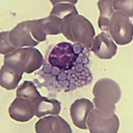 Mott细胞,浆细胞核圆形偏于细胞左上侧,染色质粗。细胞胞质充满大量数目不等,大小不一的空泡,形似桑葚又称桑葚细胞。像极了被爱的泡泡包围到角落的小朋友。常见于多发性骨髓瘤,也可见于一些反应性疾病。