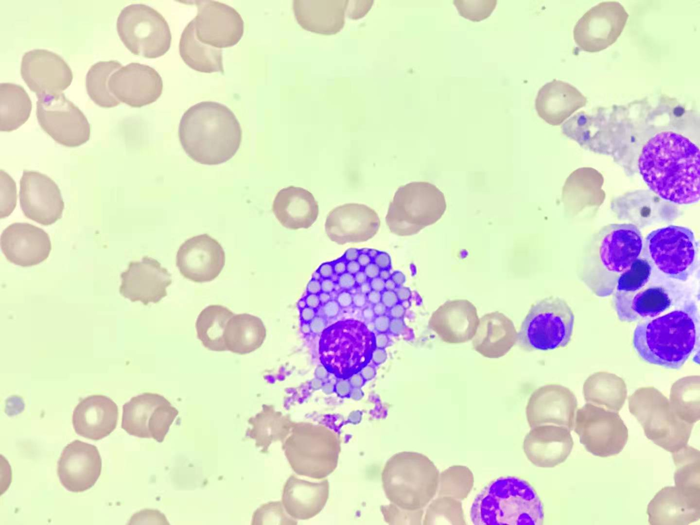 桑葚细胞,细胞核偏位,染色质疏松,常有1-2个大而清楚的核仁。多发性骨髓瘤中可见,瘤细胞胞质较为丰富内含有大量空泡的细胞称为桑葚细胞。