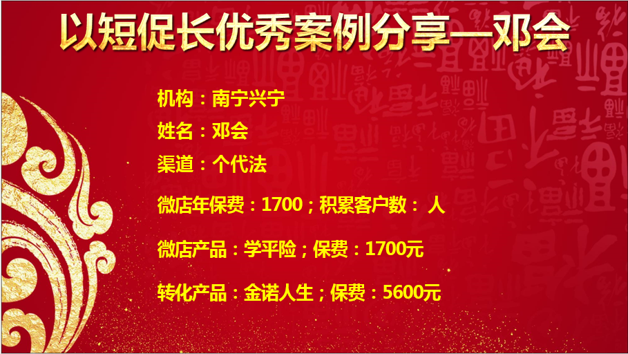 南宁兴宁业务部经理邓会,对于团体保险非常认可,自个代法开始就一直表示支持,作为业务部经理,积极学习团险知识,作部门表率,无论是团体意外险、团体高空意外险、卡单类、微店类均有出单,作为专业保险代理人,邓会经理要求部分人人学习更多知识,团险也好,财险也好,让自己专业起来才能赢得客户信任”,一个转介绍客户开始跟邓经理买了5份超能宝给孩子,保费4000多元,后来经过不断的跟进又打算在加保全家人的保险,可是工地出了点事资金周转不过来,只能明年再买,但是因为邓经理的服务得到了客户的认可,加保了的建工人意险,保费1万多,接下来又加保团体高空意外险15人,办公室5人,保费共13440元。