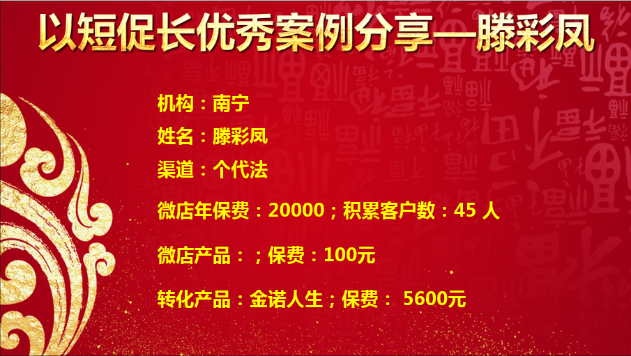 滕彩凤是南宁顾问营销一名专职保险代理人员,家里有个亲戚是开劳务公司的,之前一直在平安购买员工意外险,滕彩凤经理加入太保后,就去跟亲戚说以后团体险可以在太保买,亲戚经过价格的比对,觉得都差不多,在哪里买都是买,在2018年6月份保险到期将业务转到我司,保费共3500元,积累客户5人。