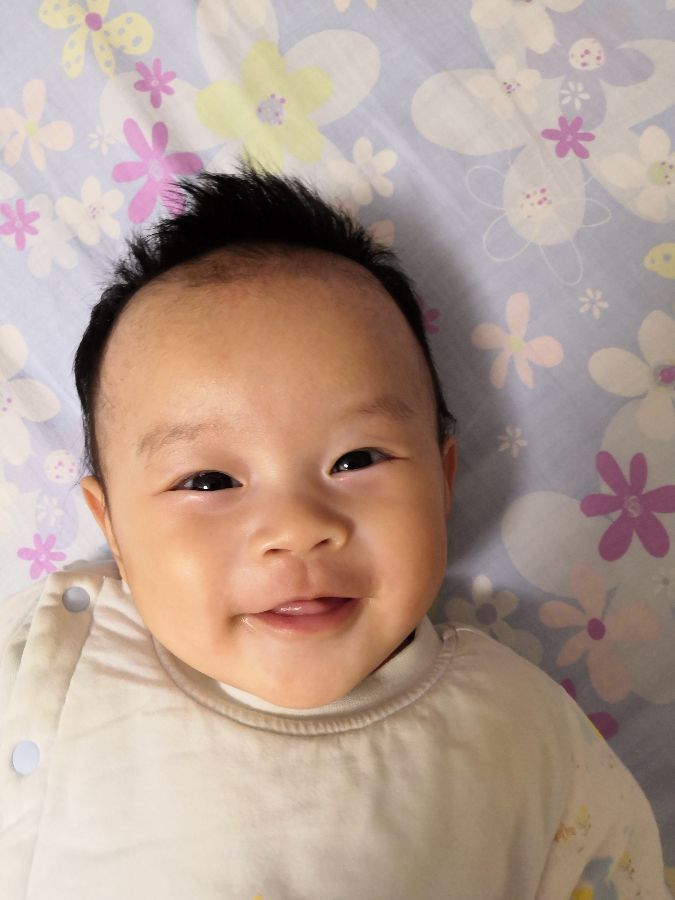 四个月的我,很爱笑,也很喜欢跟人家互动,妈妈说我是个乖巧的小宝宝。