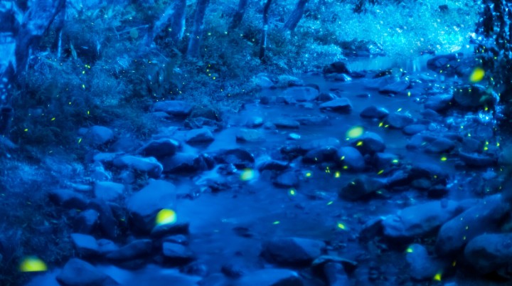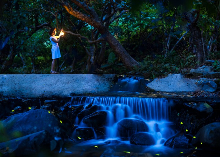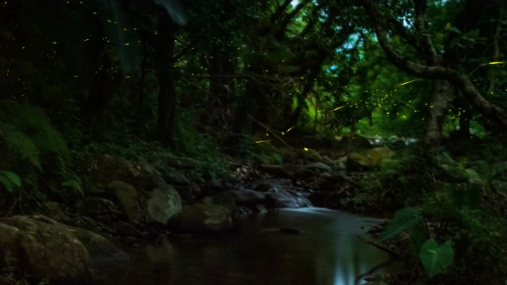 作品简介:“雨打灯难灭,风吹色更明。若非天上去,定作月边星。”(《咏萤火》,李白),这幕美妙的画面就出现在肇庆端州区睦岗街道兰龙社区龙溪栈道。这些灵动闪烁的萤火虫小精灵,营造了一片浪漫的森林栈道奇景。栈道下溪水清澈,萤火虫在栈道和小溪间自由自在地飞翔,奇妙的景象让人流连忘返。天色清朗的傍晚,漫步栈道上,萤火虫盈盈飞来,闪闪发光,如满天星河在你身边流淌。日落后,溪水呈现幽幽的蓝色,萤火虫在溪水树木间穿梭,闪亮又如天上银河,月光照亮了溪水、石头、大树,又恰如一片梦幻的“绿野仙踪”。溪水中有小水坝、萤火虫在水面起舞,穿着白裙子的小姑娘拿着小马灯,站在小水坝上,潺潺潺流水、点点萤火,美得让人觉得是在童话世界。
